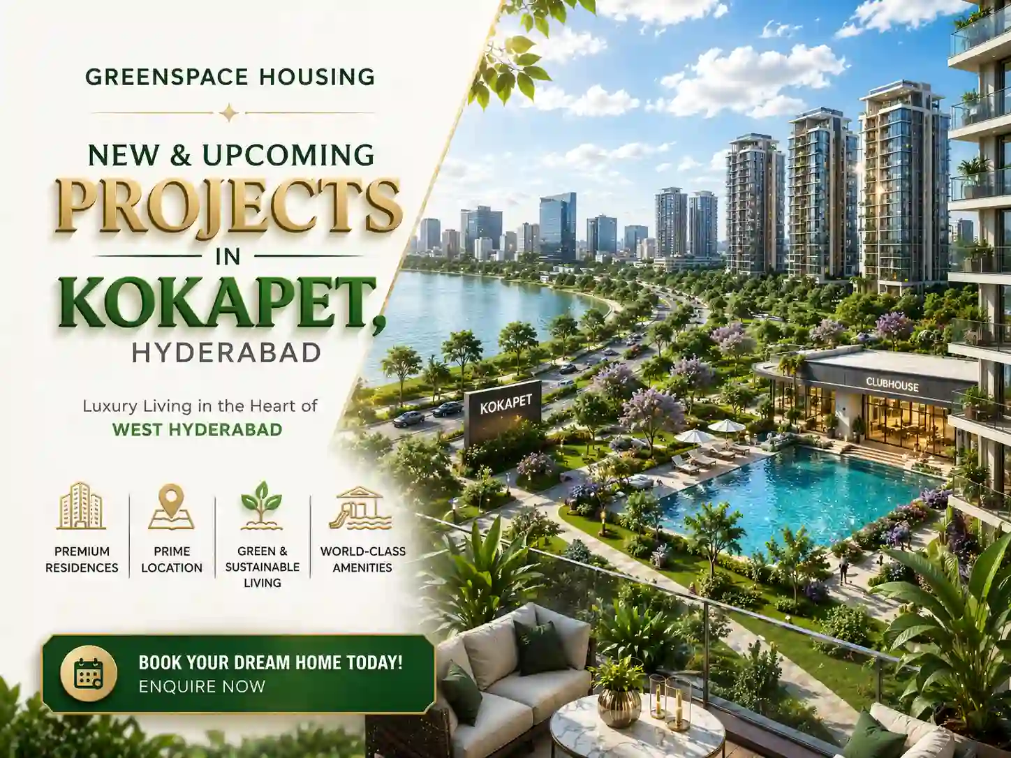 Greenspace new and upcoming projects in Kokapet, Hyderabad, are emerging as value-driven premium residential developments within the rapidly growing Financial District–Neopolis corridor, offering a balanced mix of affordability, spacious layouts, and lifestyle amenities. A key project, Greenspace Celestial, is spread across ~8.5 acres with 9 towers and 750+ apartments, featuring 2, 2.5, 3 & 3.5 BHK homes ranging from ~1,085 to 2,615 sq. ft. and a large 34,000+ sq. ft. clubhouse with 25+ amenities, catering to modern urban living. With pricing averaging around ₹7,700–₹8,000 per sq. ft., these projects position themselves competitively compared to nearby luxury developments, making them attractive for mid-segment buyers and investors seeking entry into Kokapet’s high-growth market. Strategically located just 5–10 minutes from the Outer Ring Road, Gachibowli, and major IT hubs, Greenspace developments benefit from strong connectivity and infrastructure growth, while offering low-rise gated community living (G+9 floors), which is increasingly rare in a high-rise dominated micro-market, making them a practical and high-potential investment choice in West Hyderabad.