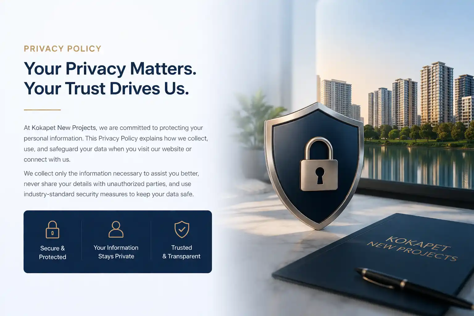 Kokapet New Projects is a trusted real estate advisory based in Hyderabad. We help home seekers find verified properties in Kokapet and nearby areas. This privacy policy clearly tells you what data we gather, why we need it, and how you stay in control.