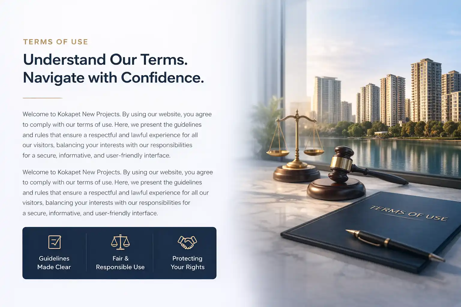 Welcome to Kokapet New Projects. These Terms of Use form a legal understanding between you (the visitor) and Kokapet New Projects. When you browse our pages, fill out any form, or talk to our team, you are agreeing to these terms fully. If you do not agree with any part, please stop using our website right away.