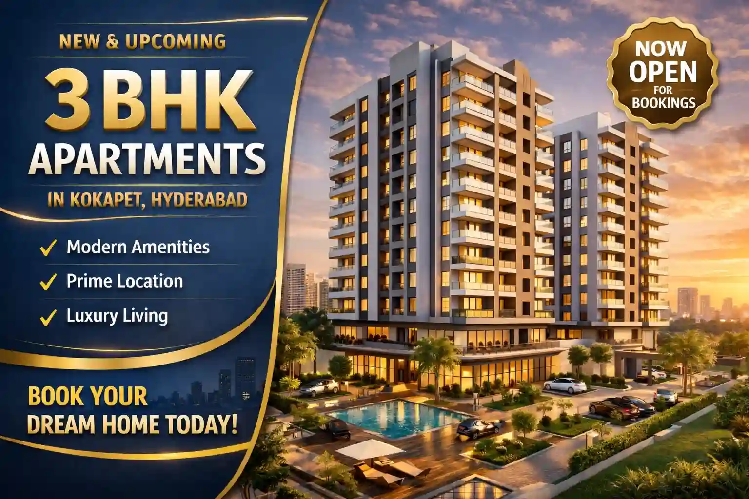 Kokapet has turned into a real estate hot spot for 3 BHK apartments in Kokapet because of its smart location. It sits right next to Wipro Circle and the Financial District. Many IT professionals choose this area for its short commute. Upcoming 3 BHK flats in Kokapet are built inside gated communities that offer clubhouses, jogging tracks, and 24/7 water supply. The Neopolis layout is bringing wider roads and more green cover. Schools like Oakridge and CHIREC are within 10 minutes. For daily needs, you have supermarkets, clinics, and cafes. If you invest in a new launch 3 BHK apartments in Kokapet, you can expect good rental returns because of high demand. The area is clean, less crowded, and has a peaceful vibe. It is one of the fastest-growing residential zones in Hyderabad.